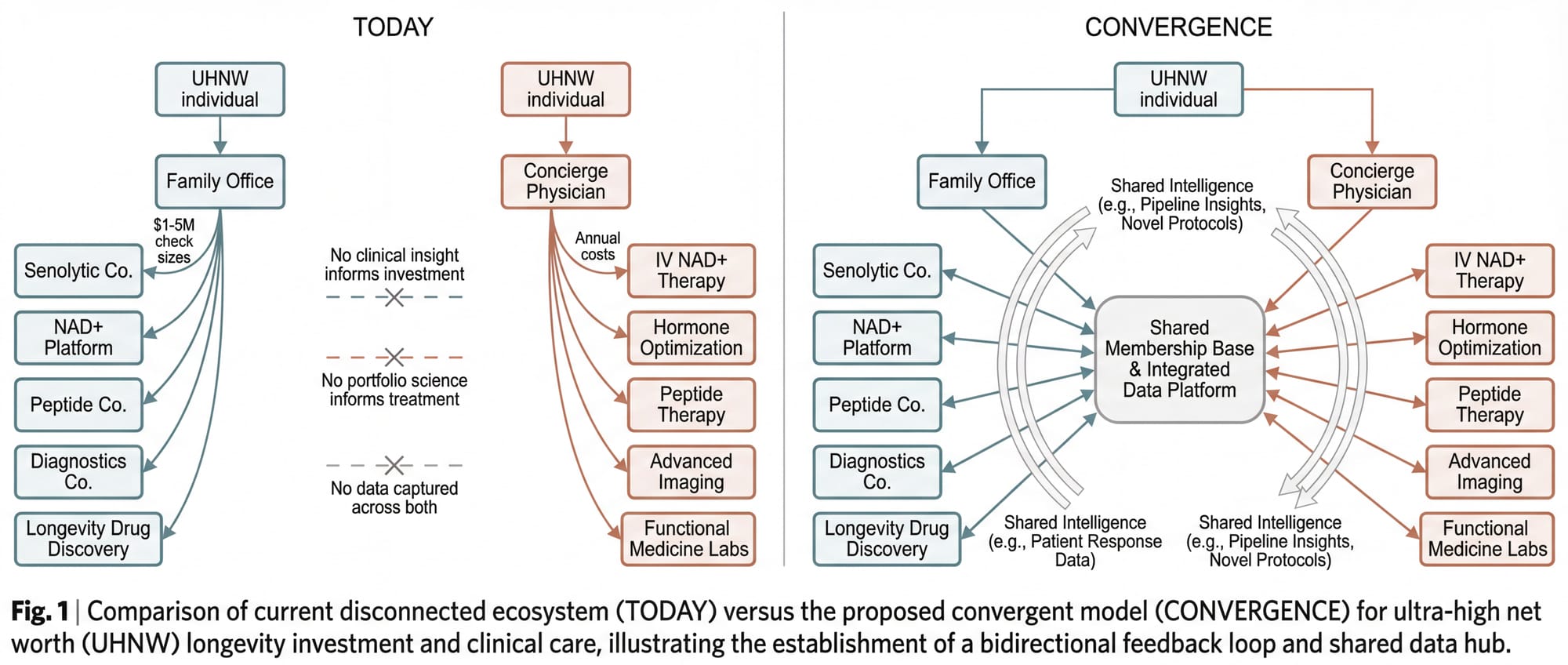 An ultra-high-net-worth individual might invest $2 million into a senolytic biotech company through their family office on Monday, and on Thursday receive an IV NAD+ infusion from a concierge physician who has no idea what's in that investor's portfolio. The investment generates no clinical insight. The clinical data generates no investment insight. The capital and the care exist in parallel universes.
