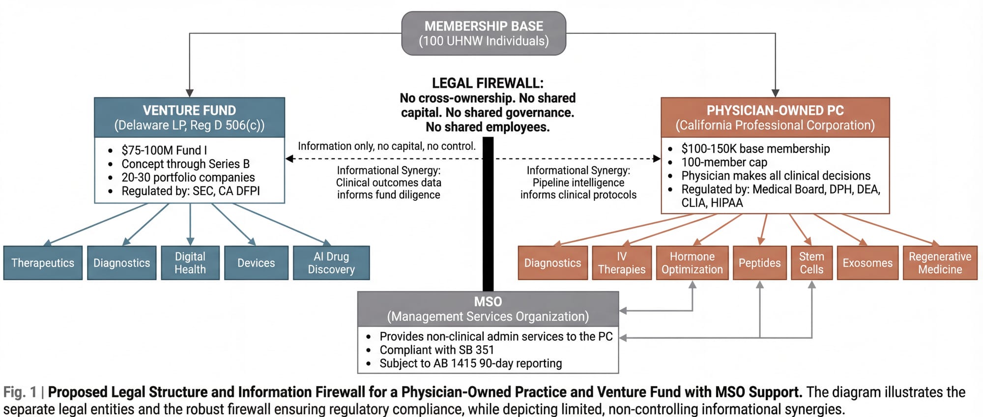 Legal complexity. California's Corporate Practice of Medicine doctrine (among the strictest in the nation) prohibits non-physicians from owning or controlling a medical practice. The fund cannot own the clinic. The clinic cannot be a subsidiary of the fund. They must be legally, financially, and operationally independent entities connected only by shared founding leadership and a Management Services Agreement. SB 351 further tightened the rules in 2026. AB 1415 added mandatory 90-day advance reporting for material MSO-PC transactions. Building a compliant structure requires a healthcare attorney with CPOM/MSO expertise, a securities attorney with fund formation experience, and a tax attorney who understands multi-entity California structures. Simultaneously.