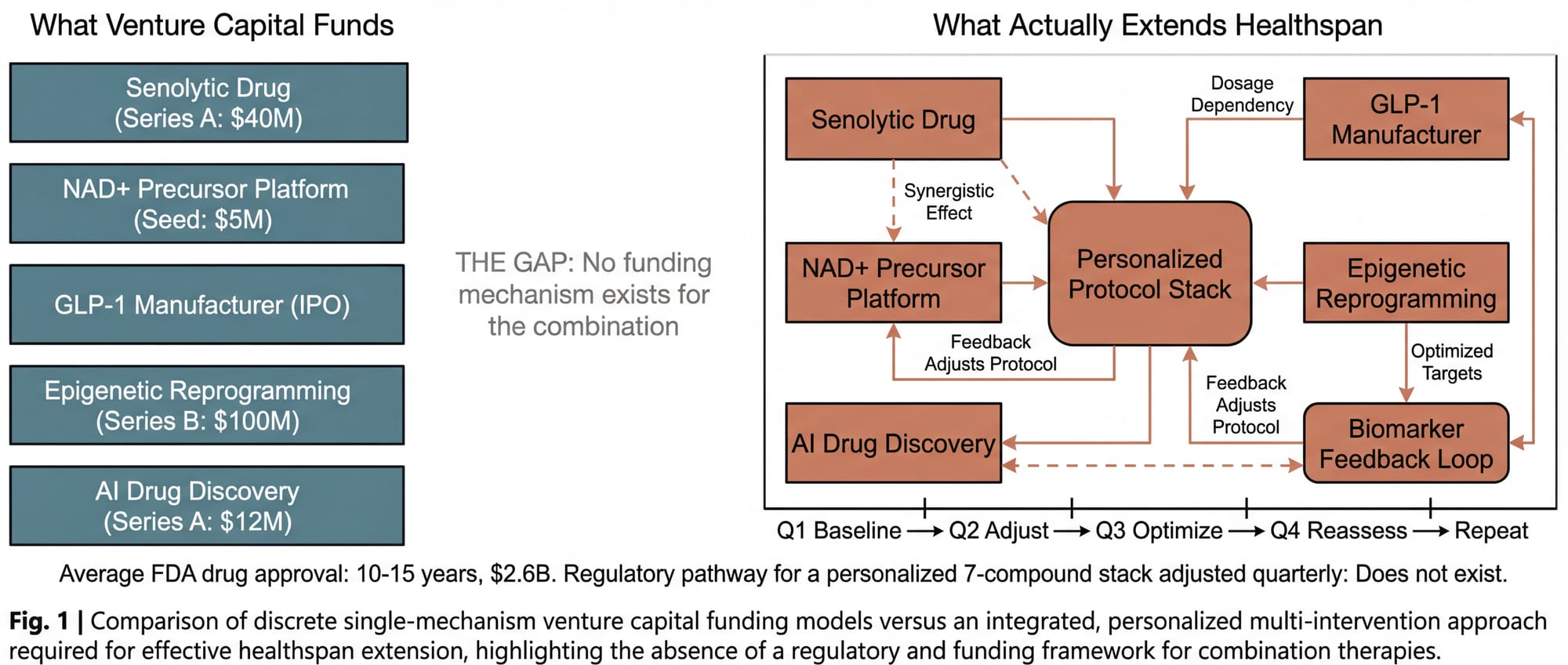Venture capital is built for discrete bets. One drug. One mechanism. One target. A senolytic company can raise a Series A. An NAD+ precursor platform can raise a seed round. Each sits in a clean box with a defined regulatory pathway.