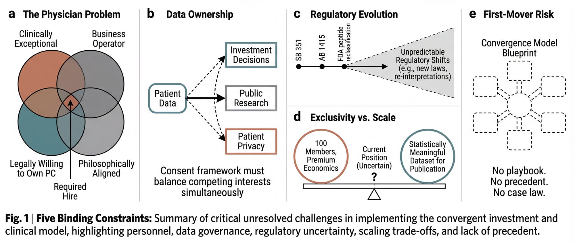 These barriers are real and non-trivial. They explain why the convergence model exists as a thesis rather than an operating entity. But they are also, every one of them, solvable with the right combination of legal architecture, physician partnership, founding capital, and the willingness to absorb regulatory complexity as a feature rather than a bug.