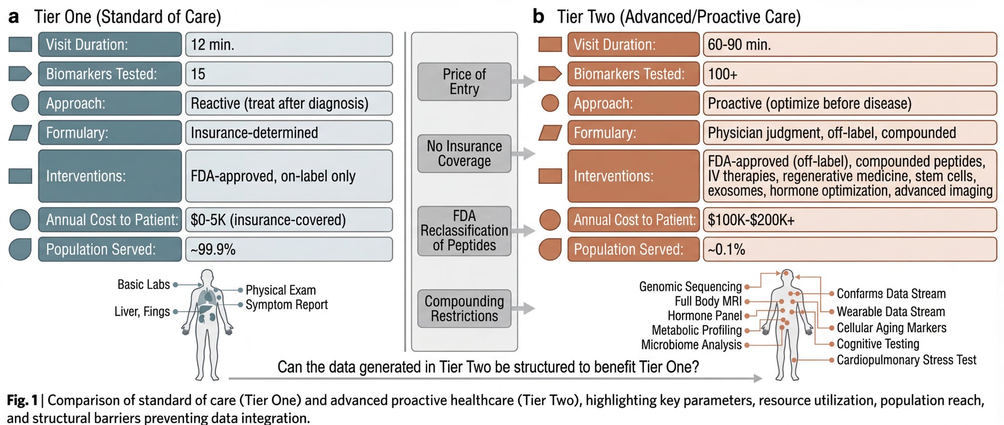 Tier One is the system most Americans experience. FDA-approved, insurance-reimbursed, guideline-driven. Reactive by design: you get sick, you get treated. Twelve minutes per appointment, a formulary determined by your insurance carrier, a standard of care defined by large-scale randomized controlled trials. This system is not designed to optimize health. It is designed to treat disease after it manifests.