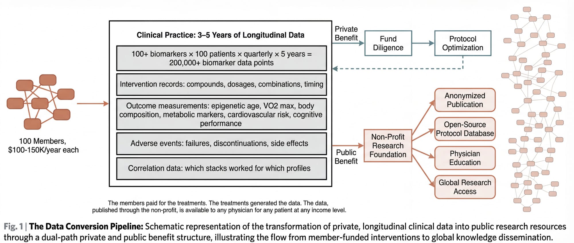 The non-profit conversion works like this: Once the dataset reaches sufficient scale and duration (likely Year 3 to 5), the practice establishes or partners with a non-profit research foundation. The foundation's mandate: to anonymize, structure, and publish the clinical outcomes data. To make the protocols, dosing schedules, combination stacks, failure reports, and longitudinal outcomes available to any physician, researcher, or institution in the world.