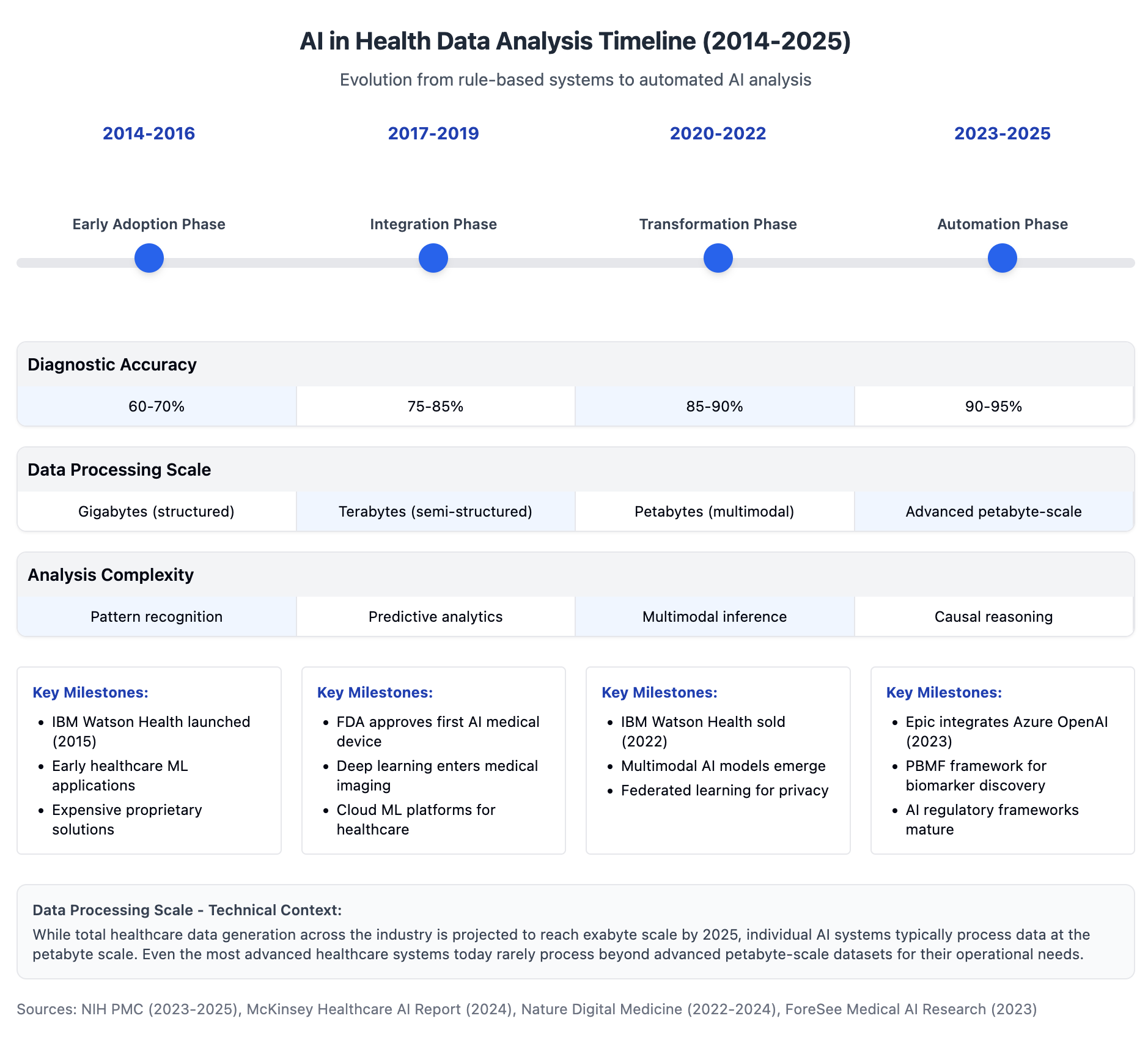 AI capabilities in health data have evolved remarkably. Diagnostic accuracy has increased from 60-70% in 2015 to 90-95% by 2025, with some systems exceeding expert-level performance. Processing power has scaled from handling gigabytes of structured data to analyzing petabytes of multimodal healthcare data in near real-time.