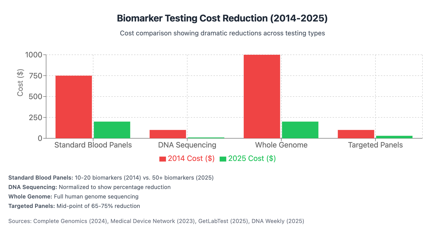 Fast forward to 2025, and the landscape has transformed dramatically. Quest Diagnostics and LabCorp have scaled their operations and slashed costs. What once cost $500-1,000 for 10-20 biomarkers now delivers 50+ biomarkers for $100-300. Targeted biomarker panels have seen cost reductions of 65-75%, while next-generation genome sequencing has dropped by 80% in the past decade.