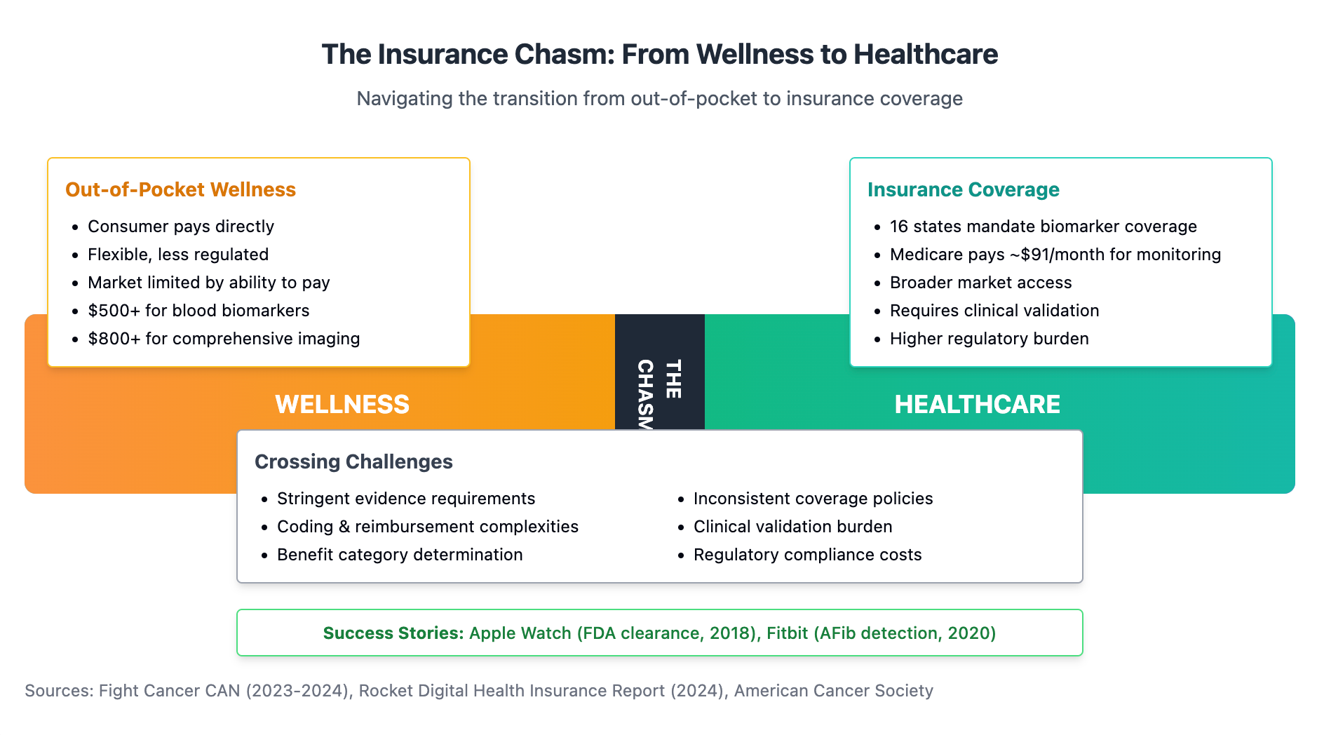 The companies that will ultimately dominate this space will be those that successfully cross the chasm from wellness to healthcare by forging partnerships with insurance providers. Function Health, for instance, may face challenges by remaining exclusively out-of-pocket, requiring customers to switch to traditional medical care when they actually get sick.