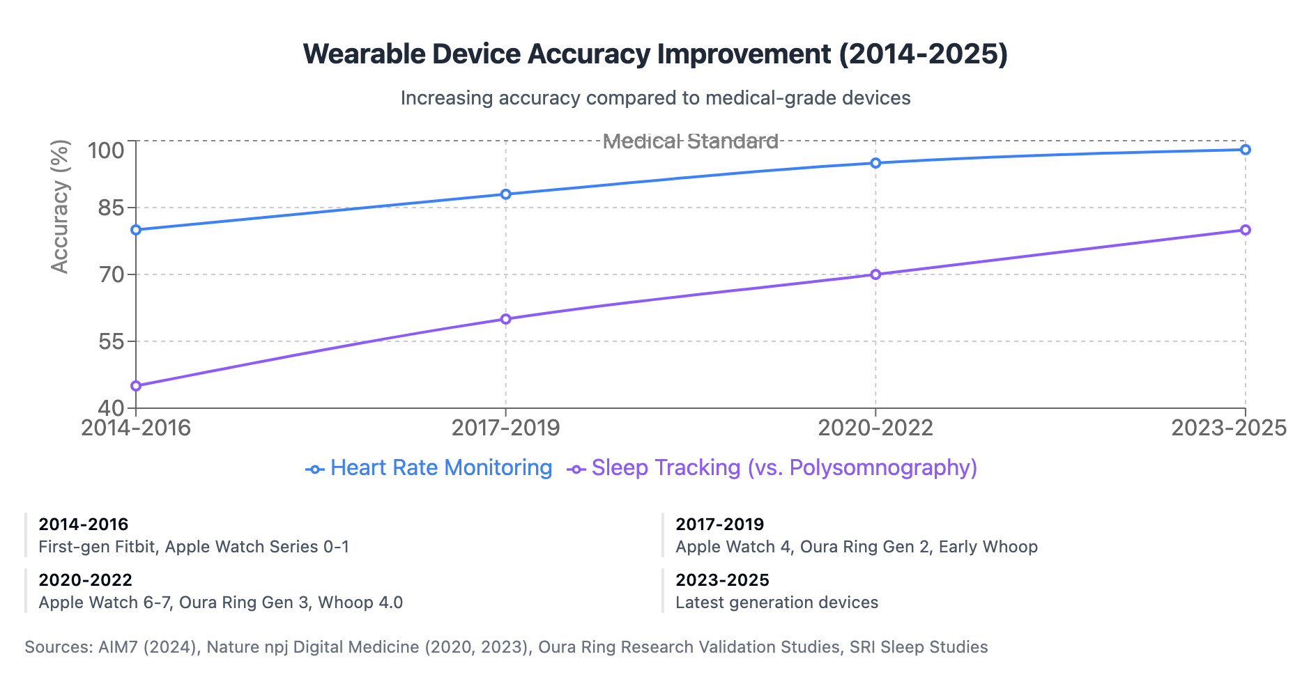Similarly, digital biomarkers have been democratized through consumer wearables. Companies like Whoop, Oura, Garmin, and Apple have made continuous monitoring of heart rate variability, sleep quality, respiratory rate, and other crucial metrics accessible to the average consumer. The accuracy of these devices has improved from 15-20% below medical standards to within 1-3% for many key metrics.